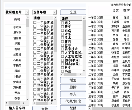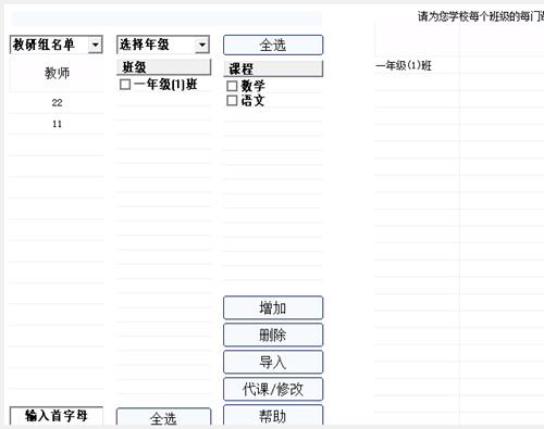 设置任课教师 在上图的教师列表中选择教师,在班级列表中选择相应的班级,课程列表中选择课程,然后点击增加按钮即可。 |