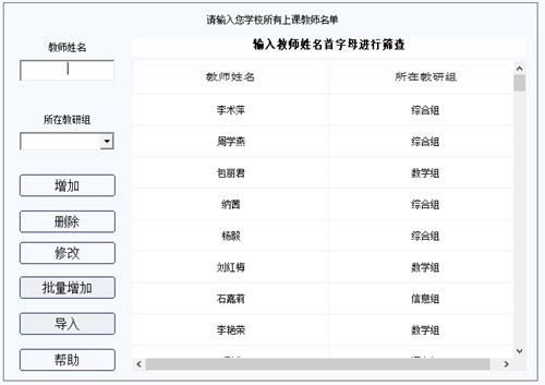 在教师姓名文本框中输入教师姓名,点击增加按钮,就可以将教师增加到右侧教师列表中。