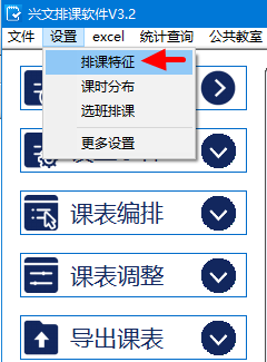 在兴文排课软件中,点击菜单:设置--排课特征,如下图:
