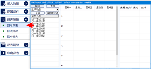 在按钮的下方将显示固定课按钮,点击固定课按钮,排课软件自动弹出如下窗口: