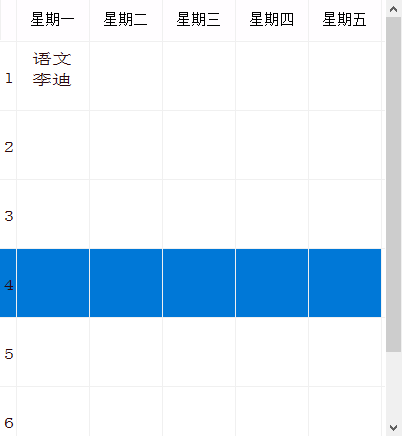 在上图中,鼠标右键点击(右击)课程表中的蓝色圆圈内,即可删除六年级(1)班星期一第一节的语文课。