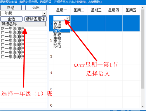 下面以设置一年级(1)班星期一第一节为语文课为例介绍使用方法: