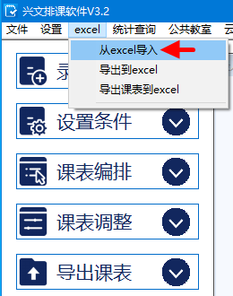 导入数据同时导入课务安排数据、条件设置和课表等excel中的数据。这些数据保存到同一个excel文件中,分成不同的表格存放。在兴文排课软件中,点击菜单:excel---从excel导入,如下图: