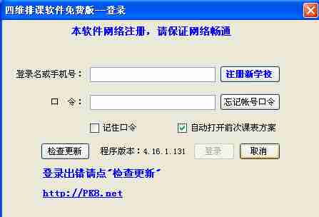 四维排课在使用时需要注册,必须保证网络畅通,在启动时排课软件会自动检测软件是否是最新版本,假如软件不上最新版本,则停止运行,并提示用户更新排课软件到最新版才能使用。